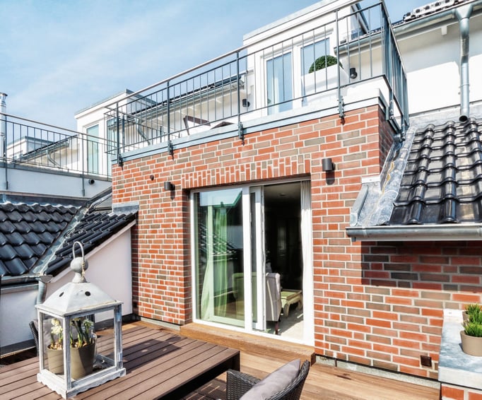 Das Wohnzimmer befindet sich auf der unteren Etage mit offener Küche, Esszimmer, Badezimmer und Abstellraum. Auf der oberen Etage liegt das Schlafzimmer (15qm) mit separatem Balkon (10qm).